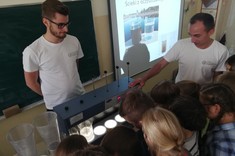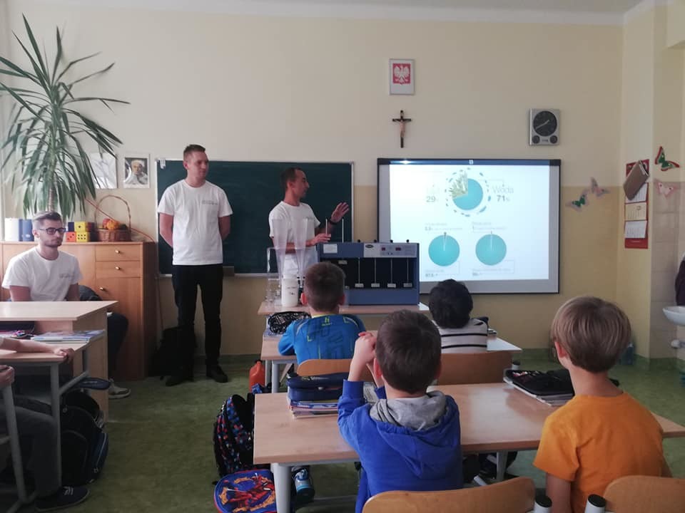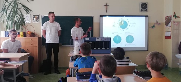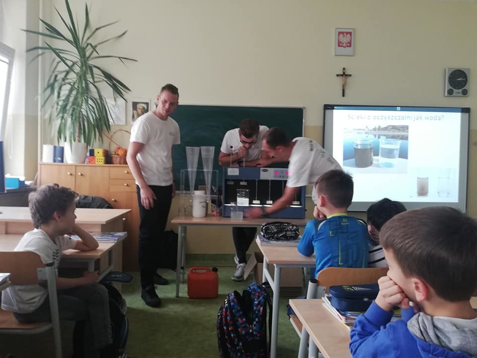 Studenci przybliżyli uczniom problematykę oszczędzania wody. Dzieci i młodzież dowiedziała się w jaki sposób woda krąży w przyrodzie, jak pracują wodociągi, kanalizacja, oczyszczalnie ścieków. Ciekawa prezentacja i filmiki prezentowały drogę wody z kranu przez kanalizację, do oczyszczalni ścieków i dopiero do rzeki. Uczniowie, szczególnie najmłodsi z dużym zainteresowaniem przyglądali się prezentacji i z zaciekawieniem obserwowali przeprowadzane doświadczenia, w których mogli asystować. Oddzielanie zanieczyszczeń i filtrowanie wody okazały się najciekawsze.
